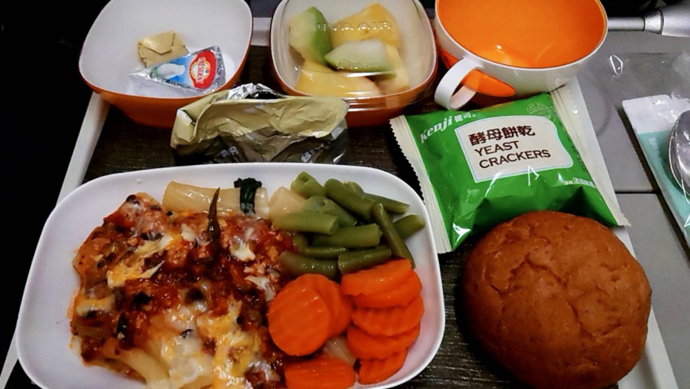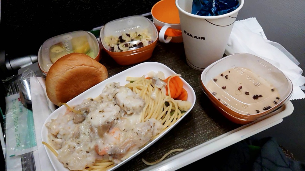 搭乗1時間後に提供されたシーフードパスタ。選ばなかった方はビーフシチューだった気がする。そっちも美味しそうだった。