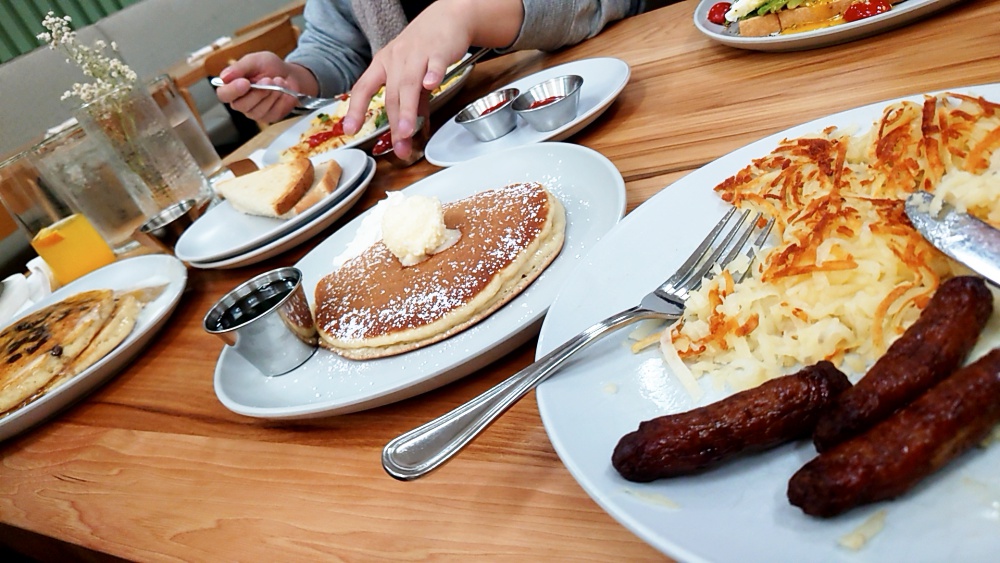 一番右のハッシュドポテトが最もクラシックな朝食とのこと。「ホットケーキも食べる?」と聞かれて、安易に返事をしてしまったことを後悔している。シロノワールのノーマルサイズを頼んでしまった気分だ。