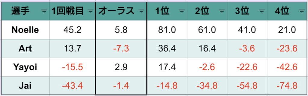 私はこのイベントへの出場が決まった時、点数申告がどのように行われているのか、何度も動画で確認した。すると、ほとんどの動画内で「1000 is 1300」と口にしているのだ。これはおそらく日本の「1000は1300」をそのまま導入した形なのだろう。しかし待ってほしい。英語と日本語は異なる文法である。日本の「は」は必ずしも主語を表すものではない。しかし英語の「is」は「=」を意味するものなのだ。1000は決して1300とイコールで結ばれる数値ではない。レイチェルが完全に正しい。こちらの表現を普及させるべきだと強く訴えたい……。そんな彼女の申告に聞き惚れながら私はというと、1半荘の1プレイヤーにおける平均的なリーチの数を打ったと記憶しているが、どれ一つあがった記憶がない。悲しい。ラスを引かなかっただけでもまだマシか。